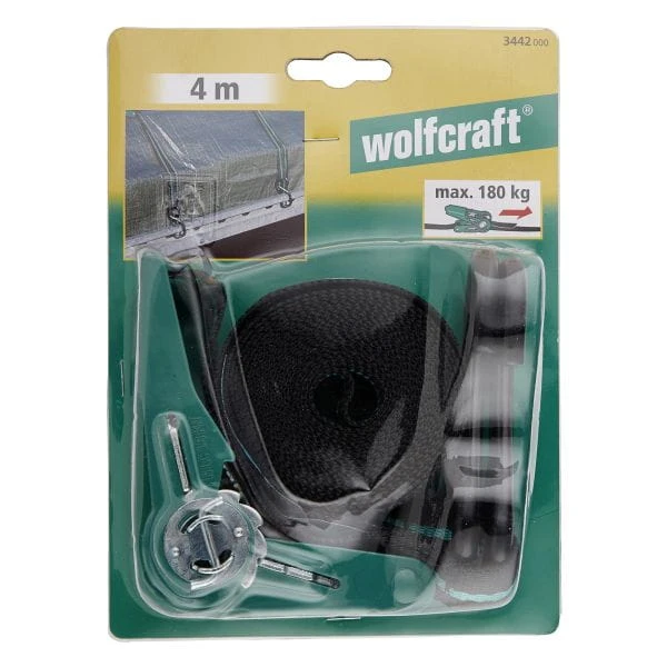Zacisk taśmowy 4 m/180 kg Wolfcraft - z mech. zapadkowym i hakiem